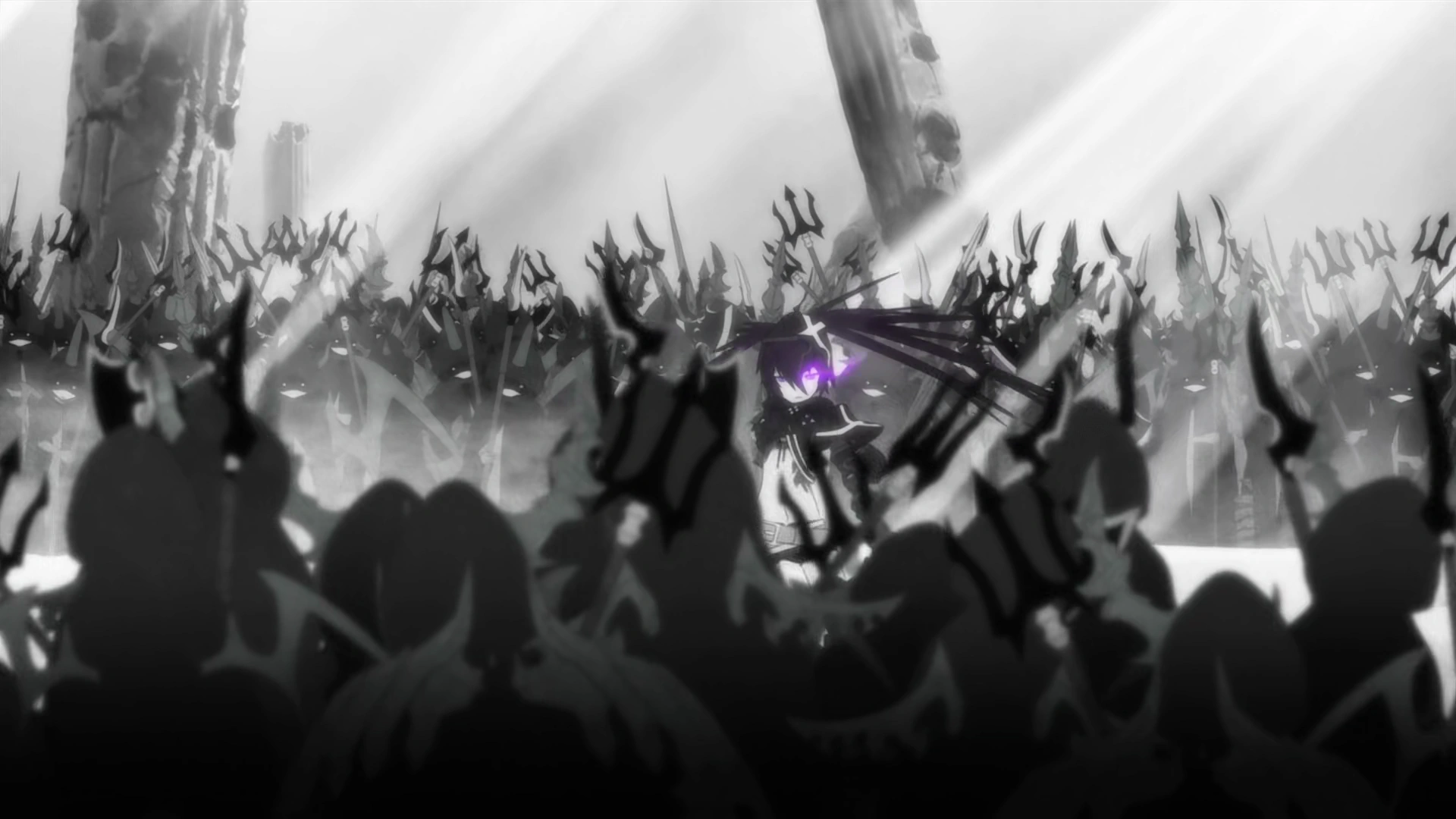 What remained of Dead Master's world consequently transformed to reflect Black★Rock Shooter's new state, and Black Gold Saw, who had been in the area observing them, witnesses these events occur. She immediately takes a stand against Insane Black★Rock Shooter, who readies her Insane Cannon Lance in response. Black Gold Saw rushes straight for her and leaves a deep gash in her right arm. Mato reacts to this and writhes in pain, but Insane Black Rock Shooter is completely indifferent to the injury and rips her own arm off, causing Mato to scream and pass out from the pain. Insane Black★Rock Shooter throws her Insane Cannon Lance and fires an intense hail of bullets, forcing Black Gold Saw to shield herself using her King Saw.