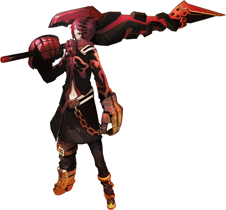 MZMA has the appearance of a young man with short deep crimson hair. His outfit consists of bright red clothes that look like a trenchcoat, and a pair of gauntlets and boots with asymetrical features. On his left eye is an ornament in the shape of a spine.